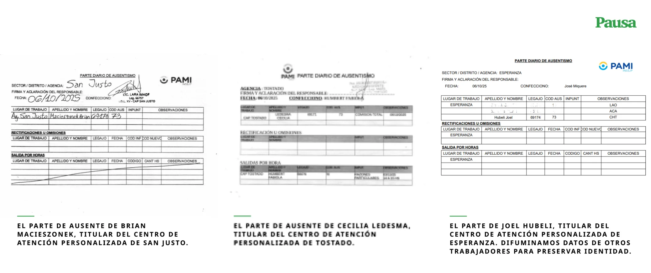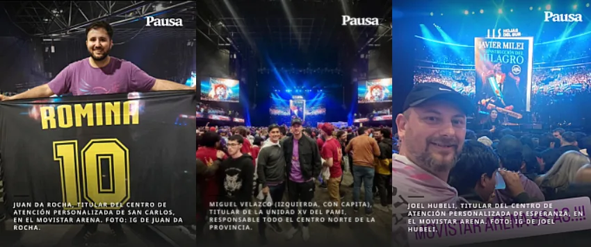 Cecilia Alejandra Ledesma, jefa del Centro de Atención Personalizada de PAMI de Tostado, Joel Matías Hubeli, de Esperanza, Elisabet María Micocci, de Santo Tomé, y Juan Da Rocha, de San Carlos, cobraron como días trabajados el 6 y 7 de octubre, pese a que usaron ese tiempo en ir a ver a Milei en su recital y presentación de libro “La construcción del milagro”. Brian Gustavo Macieszonek, de San Justo, obtuvo ese reconocimiento sólo por el lunes 6, dado que se presentó el martes a trabajar (tarde) en su agencia.