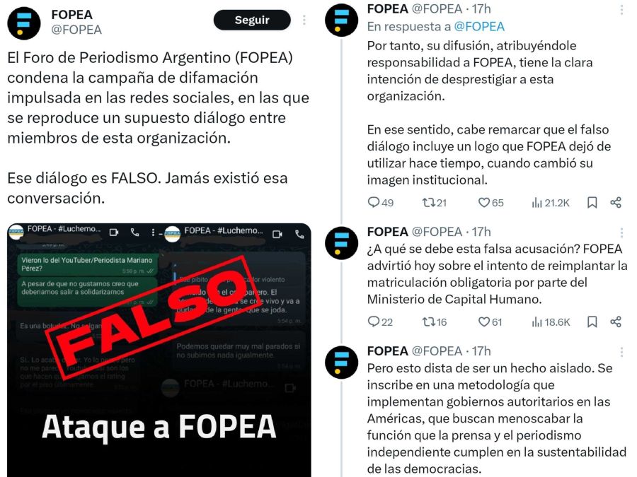 «El Foro de Periodismo Argentino condena la campaña de difamación impulsada en las redes sociales, en las que se reproduce un supuesto diálogo entre miembros de esta organización», comenzó diciendo mediante un posteo FOPEA. Y lanzó tajante: «Ese diálogo es FALSO. Jamás existió esa conversación».