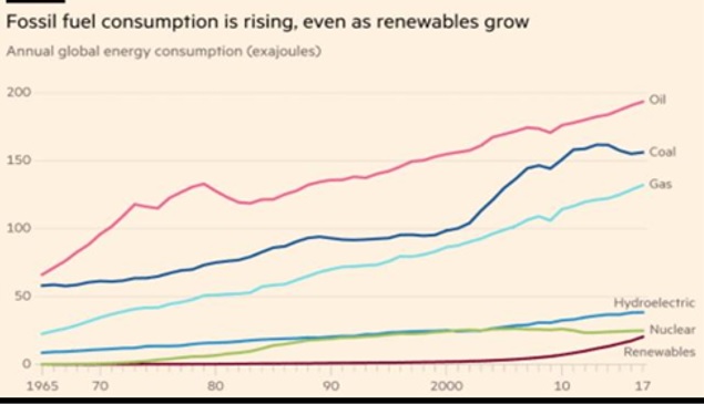 China es la nación que más CO2 libera y la que más centrales a carbón está construyendo (se estima que su consumo de carbón aumentó 4,5% en 2018). De hecho, las grandes potencias verdes son las naciones que más emisiones liberan, y el consumo de hidrocarburos crece a pesar del incremento de energías renovables.