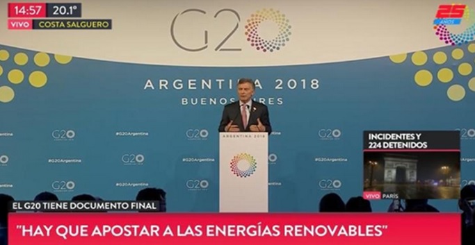 Invocando el Acuerdo de París de 2015 y la lucha contra el calentamiento global, el presidente Maurizio Macrì se ha lanzado a salvar al género humano de la extinción en 2100, mediante un programa de sustitución de energías fósiles por renovables, en especial eólicas y solares y, en ínfima proporción, biomasa, biogás y pequeños aprovechamientos hidroeléctricos (menores a 50 MW). “Estamos en un punto límite con el cambio climático. Hay que apostar a las energías renovables”, señaló Macrì durante su cierre en el G20. Para ello duplicó la apuesta en cuanto a reducción de emisiones de dióxido de carbono (CO2). El entusiasmo del Presidente lo llevó a decir que la Argentina podría ser potencia mundial en energías limpias. Nada menos. La Argentina del Año Verde.