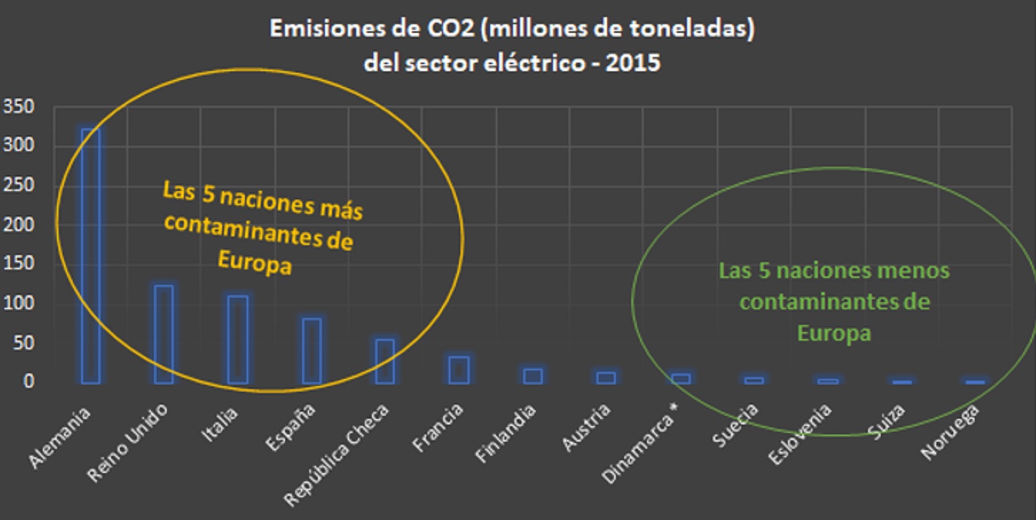 En Europa, las naciones que más CO2 liberan son las grandes potencias verdes: Alemania, Reino Unido, Italia y España. Las que menos CO2 liberan tienen una altísima incidencia de renovable hidráulica (de alta potencia) y núcleo-electricidad. Todo lo contrario de lo que ocurre aquí.