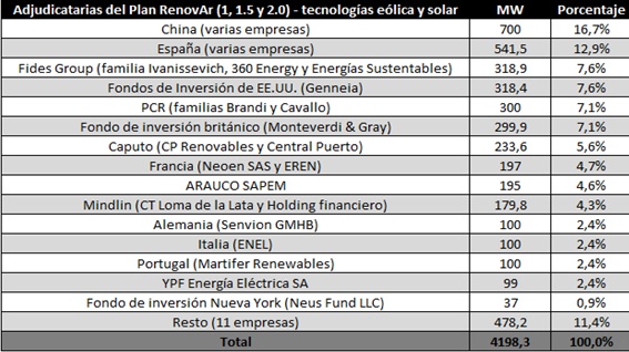 Sobre la base de estos datos, el Observatorio reconstruyó que el 24,7% de la potencia adjudicada para estas tecnologías benefició a empresas europeas de Alemania, España, Italia, Francia y Portugal, lo cual significa una cuarta parte. Les siguieron con un 16,7% del total diversas empresas chinas. Las españolas se quedaron con un 12,9%, con la quebrada empresa Isolux a la cabeza (9%). Entre Caputo y Mindlin llegaron al 10% de lo adjudicado, con lo cual fueron los primeros ganadores privados del país. Genneia S.A. fue la empresa privada argentina con mayor adjudicación del RenovAr, 7,6%. Pero en el lapso considerado cambió de manos, de Fidesa Group (familia Ivanissevich) a los fondos de inversión de Estados Unidos, que incluyen al socio del Grupo Clarín, David Martínez. Ninguna de ellas recurre a aerogeneradores fabricados en el país, es decir que el empleo de calidad y el desarrollo industrial quedan fuera de las fronteras y los únicos beneficiados son los Macrì y allegados. La participación de la industria nacional se redujo a pocos componentes, mientras que los proyectos con genuina participación de industriales argentinos son menores al 5% sobre el total adjudicado.