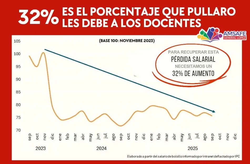 A raíz del llamado del gobernador Maximiliano Pullaro a paritarias docentes para las semanas posteriores a las elecciones legislativas del próximo domingo 26 de octubre, el gremio de docentes públicos, Amsafé, volvió a reclamar este miércoles la deuda que la gestión provincial mantiene con los profesionales de la educación. «Necesitamos una recomposición salarial del 32% para recuperar lo perdido desde el inicio de su gobierno», manifestaron desde el sindicato.