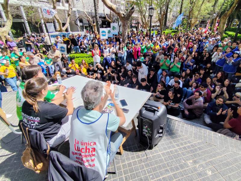 Por su parte los docentes de la Universidad Nacional de Rosario iniciaron la medida de fuerza declarada por 48 horas con una clase pública en la plaza Pringles, a la que se sumaron alumnos, centros de estudiantes de las distintas facultades y la Federación Universitaria de Rosario, junto a trabajadores no docentes representados en el gremio Apur, en una jornada que continuó con una marcha hacia el Monumento a la Bandera para el acto central.