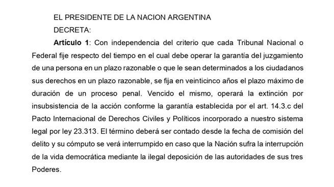 Uno de los documentos filtrados por Arrieta esta noche es un decreto que, como tal, eventualmente debería llevar la firma del Presidente, que tiene por objetivo promover la libertad de aquellos genocidas que se encuentren detenidos habiéndose superado un plazo de 25 años desde la comisión del delito.