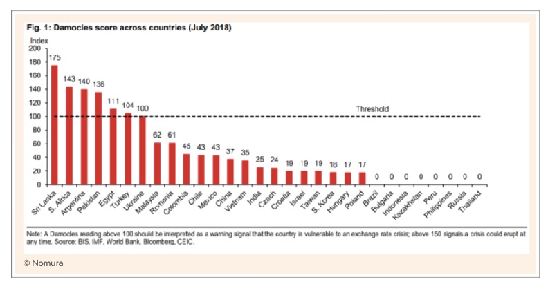 Recientemente el Financial Times publicó una nota sobre exposición al riesgo cambiario en mercados emergentes, dando cuenta de la publicidad del Índice Damocles elaborado por el Banco Namura (en la ilustración principal de esta nota). El país más expuesto a sufrir corridas cambiarias es Sri Lanka, ubicada al sur de la Inda y conocida como la isla de los mil nombres. El segundo país es Sudáfrica, cuyo Presidente del Banco Central se desmarcó de la situación de fragilidad financiera que vive nuestro país hace unas pocas semanas. Y a nosotros nos tocó el tercer lugar, con un puntaje de 140 sobre 200, que mide la máxima exposición (referencialmente, 100 es el umbral que diferencia la región entre economías emergentes con baja y alta exposición). Turquía quedó muy por detrás, es decir que la verdadera tormenta la causó el gobierno argentino.