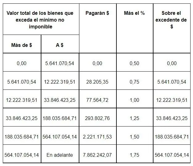 Por otro lado, quedarán exentos los bienes gravados situados en el país cuando la suma de todos sea inferior a $11.282.141,08. Cuando superen esa cifra el excedente pagarán 0,5% , y de allí en más la escala que puede consultarse en la página www afip.gob.ar.