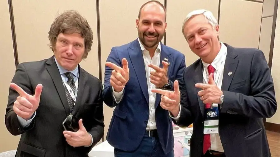 El vínculo de Milei con Bolsonaro viene a través del hijo del presidente saliente, el diputado brasileño Eduardo Bolsonaro. Este hizo a mediados de octubre una recorrida por Argentina. Además de instalar la tesis de una «argentinización de Brasil» si Lula ganaba las elecciones, el legislador se reunió con varios dirigentes de la derecha local.