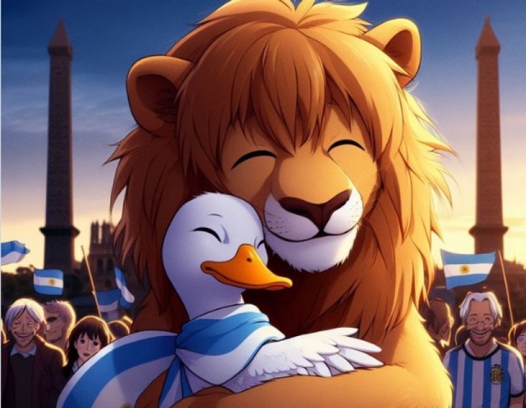 Un dibujo de un león abrazando a un pato con una bufanda de la Argentina, esa fue la respuesta inmediata vía Twitter que posteó el candidato libertario Javier Milei después de la conferencia de prensa que brindó la titular del PRO, Patricia Bullrich.