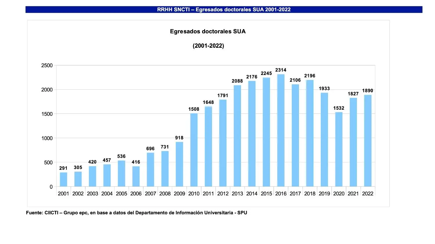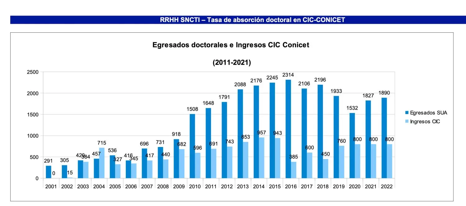 Según los últimos datos con que se cuenta, “En 2022 egresaron de las universidades nacionales 1890 doctorados, y en 2021, 1827 –detalla Nicolás Lavagnino, investigador de Economía, Política y Ciencia (EPC, perteneciente al Centro Iberoamericano de Investigación en Ciencia, Tecnología e Innovación, dependiente de la Universidad Nacional de San Martín y la Universidad Nacional de la Plata)–. Todo indica que esos números incluyen algunos demorados por la pandemia. Pero en 2020 fueron 1532”. De acuerdo con Lavagnino, en 2015 fueron 2245 y se llegó a un tope en 2016, con 2314. “Entre 2015/16 y 2022 hubo una caída del 20%”, subraya.