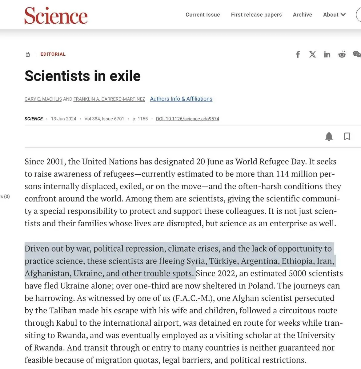 En los últimos días, un editorial de la revista Science (DOI: 10.1126/science.adq9574) incluyó a la Argentina entre los países que expulsan científicos “por guerra, represión política, crisis climática o falta de oportunidades para investigar” (un grupo en el que también se encuentra Siria, Turquía, Etiopía, Irán, Afganistán y Ucrania).