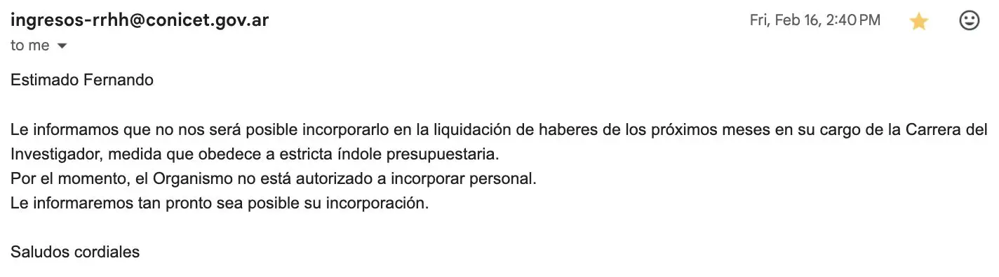 Desde diciembre hasta hoy, si se considera el personal permanente (no incluye becarios), tanto investigadores como personal de apoyo o personal técnico administrativo de planta, por jubilación o renuncia se fue un 2%, unas 344 personas. Para los llamados ‘artículo 9’ [personal contratado, los primeros en ser despedidos, aunque son profesionales de alta especialización vitales para el normal funcionamiento del organismo], ese número fue del 12%. El sistema se está desgranando por la incertidumbre, los recortes, la negativa a pagar los subsidios.