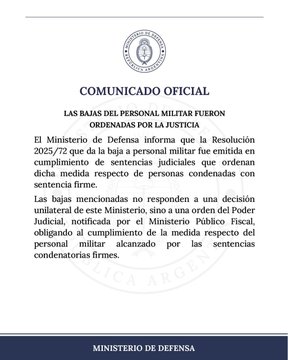Para entonces, desde Defensa, habían salido a decir que, en realidad, tenían las manos atadas y que estaban cumpliendo con una disposición judicial. “Las bajas mencionadas no responden a una decisión unilateral de este Ministerio, sino a una orden del Poder Judicial, notificada por el Ministerio Público Fiscal, obligando al cumplimiento de la medida respecto de personal militar alcanzado por las sentencias condenatorias firmes”, se excusaron desde la cartera que conduce Petri.