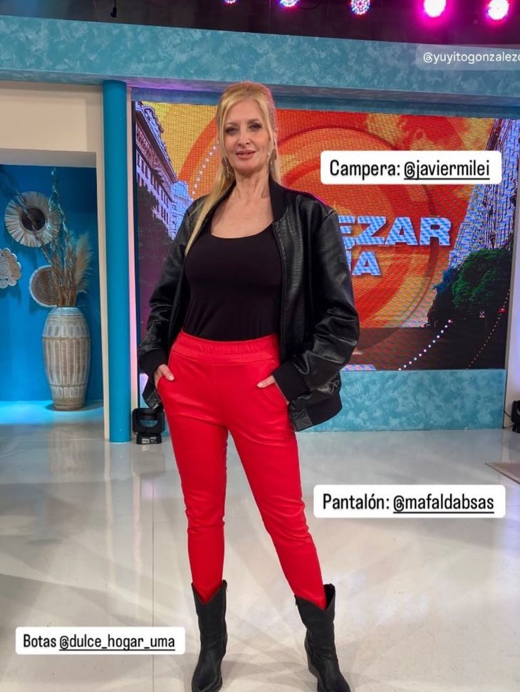 Por si no quedó claro, la ex vedette marcó territorio en sus redes sociales, en donde destacó la ropa que llevaba puesta y contó que su novio y presidente le prestó la campera de cuero que usa habitualmente para completar su look.
