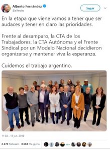 A propósito, Fernández y Cristina visitaron en la Asociación Bancaria a los sindicalistas que vienen resistiendo a pie firme la ofensiva del gobierno contra sus empleos y sus ingresos. Entre ellos estaban el camionero Hugo Moyano, el bancario Sergio Palazzo y el secretario general de la CTA, Hugo Yasky. El conciso comunicado que acompañó la foto de rigor postula como objetivo la defensa del trabajo, mientras el macrismo señala entre las ventajas del acercamiento de Pichetto la posibilidad de aprobar las reformas laboral y previsional que exige el FMI. Pichetto nunca se pronunció en contra, sólo alegaba que no prosperarían sin la adhesión de la CGT, que no tuvo entonces ni tendría el año próximo en la dudosa hipótesis de la reelección.