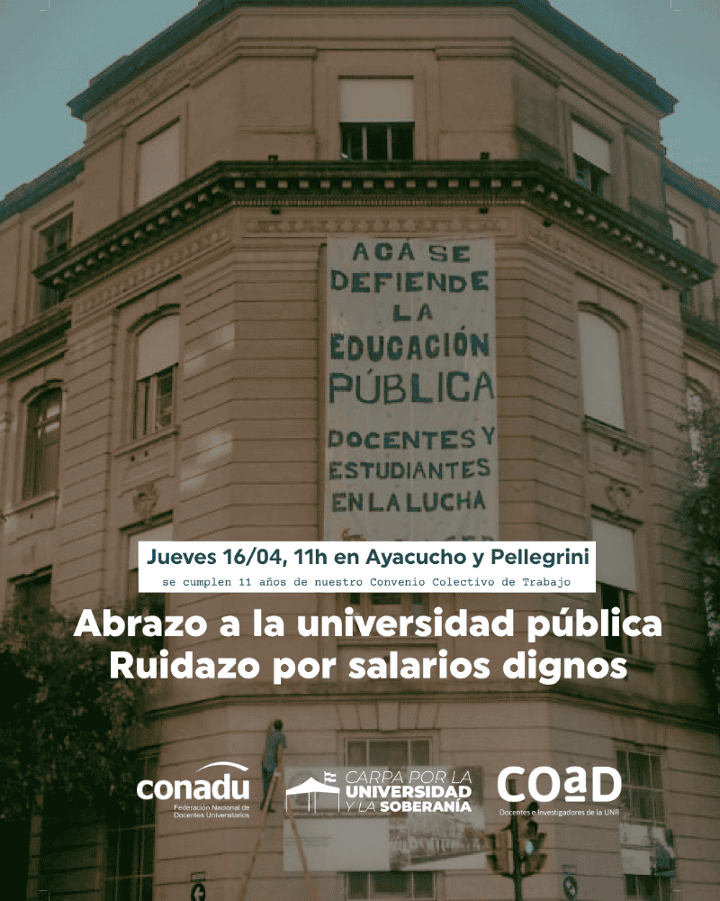 Bajo la consigna de defender la universidad pública y exigir salarios dignos, el gremio realizará un «Abrazo Solidario» y un «Ruidazo» a partir de las 11 frente a la Facultad de Ciencias Exactas, Ingeniería y Agrimensura y el Instituto Politécnico Superior.