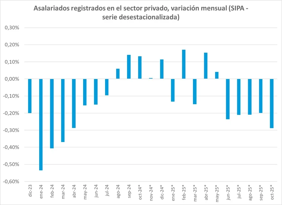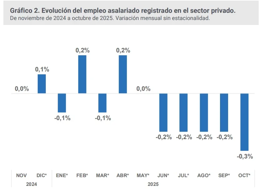 Lejos de tratarse de un hecho aislado, el retroceso se inscribe en una tendencia persistente: entre junio y octubre de 2025, el empleo asalariado del sector privado acumuló una pérdida de 71.000 puestos, con un impacto concentrado en medianas y grandes empresas de los sectores industrial y comercial.