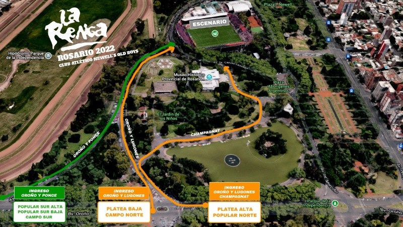 Aquellas personas que hayan adquirido entrada popular sur alta y baja y campo sur deberán ingresar por calle Oroño y Ponce. Por Oroño y Lugones será la puerta de quienes compraron platea baja y campo norte. Por último, platea alta y popular norte el ingreso será por Oroño y Lugones y deberán doblar por Champagnat.