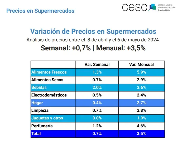 De acuerdo al Centro de Estudios Económicos y Sociales Scalabrini Ortiz (CESO), el Índice de precios de supermercados (IPS-CESO) arrojó un incremento del 0,7% en relación con la semana anterior y de 3,5% respecto de cuatro semanas atrás. El documento al que accedió El Destape remarcó que «no se observan rebotes», aunque los productos de electrodomésticos que «tuvieron muchas semanas de estar prácticamente sin cambios (ancla cambiaria, altos márgenes, pocas ventas) se acercaron al promedio».