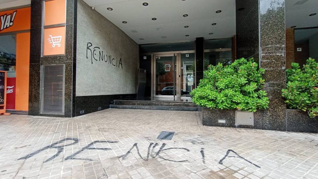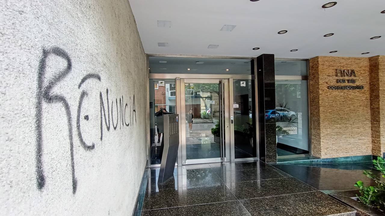 Vecinos avisaron a los familiares del vice Daniel Astruzzi que este viernes pasadas las 7 encontraron la entrada del edificio y la vereda escritos con aerosol negro. El mensaje se centró en pedidos de renuncia y “elecciones ya”.