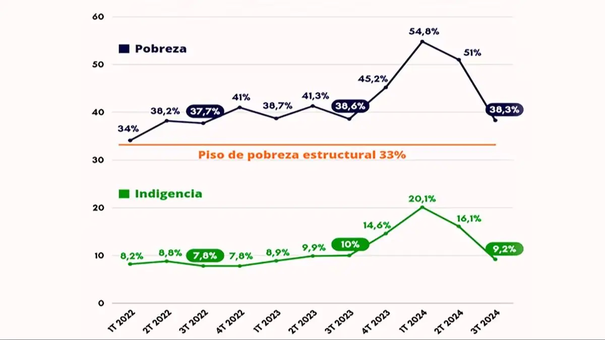 En el marco del plan de devaluación, liberación de precios y ajuste de gastos aplicado por el actual Gobierno, en el primer trimestre de 2024 la pobreza creció interanualmente de 38,7% a 54,9%; al mismo tiempo que la indigencia pasó de 8,9% a 20,3%. Sin embargo, con la desaceleración inflacionaria y lenta recuperación económica tuvo lugar un descenso significativo de estos índices; el cual parece haber continuado hasta ahora, aunque a un ritmo más lento.