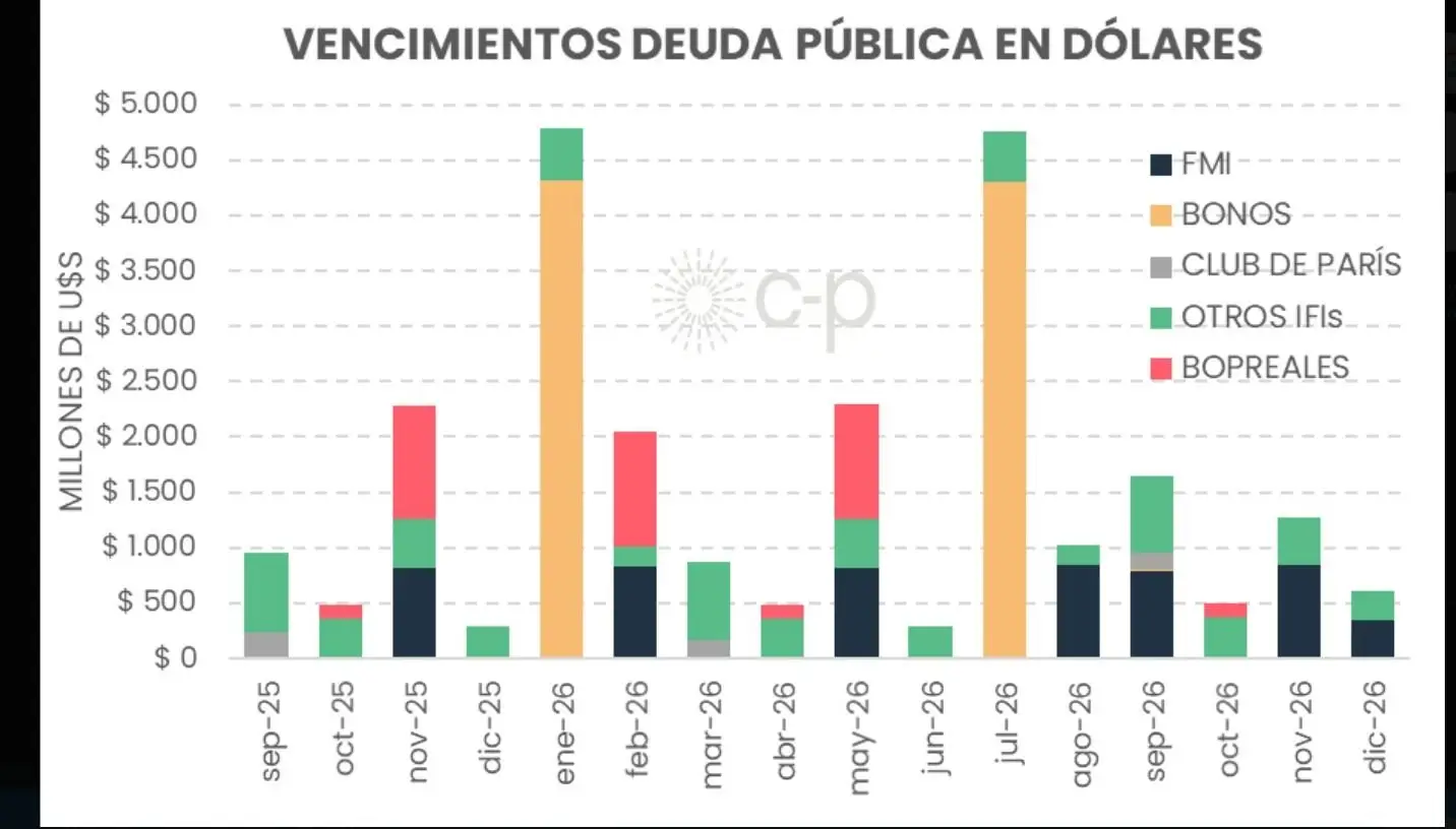 La fragilidad del esquema no solo se manifiesta en la urgencia por frenar el dólar antes de las elecciones. También aparece en el calendario de vencimientos de deuda pública, que se acumulan en los próximos meses y condicionan la sustentabilidad del programa económico.