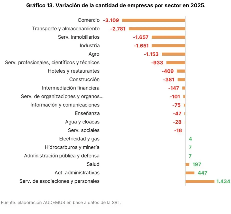Según un informe de la consultora Audemus, la mayor cantidad de cierres se dio en Comercio (-3.109), seguido por Transporte y almacenamiento (-2.781), Servicios inmobiliarios (-1.657) e Industria manufacturera (-1.651). Estos sectores explicaron en conjunto casi el 90% de la destrucción neta de empresas durante 2025. No obstante, el Agro y la Intermediación financiera, dos de los sectores más dinámicos, también perdieron firmas (-1.153 y -147, respectivamente). El único sector que presentó una suba en la cantidad de empresas fue Hidrocarburos y minería (+7).