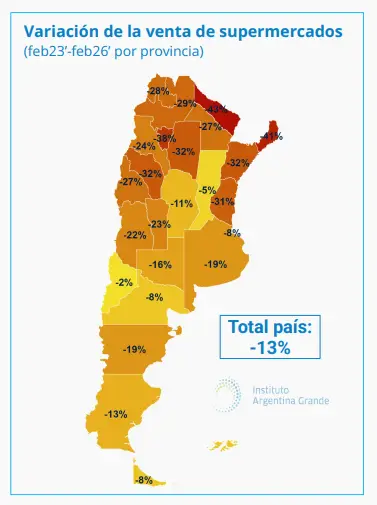 De este modo, las ventas en supermercados se ubicaron 11% por debajo de noviembre de 2023 (serie sin estacionalidad). La variación interanual en el total país fue de -13%, y si bien las bajas son generalizadas hay diferencias por regiones. Según detallaron desde el Instituto Argentina Grande (IAG) en el Noreste Argentino (NEA) la variación promedio fue de -36% y en el Noroeste (NOA) del -31%, en otras palabras, contra febrero de 2023 la compra en supermercados se contrajo un tercio (en términos reales). Por último, la Provincia de Buenos Aires (-19% contra 2023) evidenció una imagen heterogénea: en el Conurbano cayeron 22% en términos reales y en el resto de la PBA un 13%.