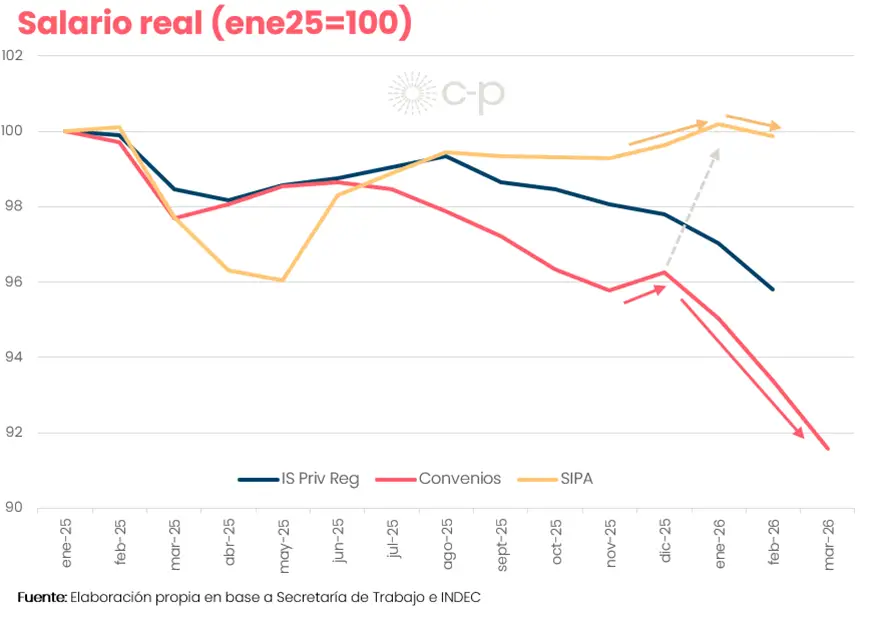 De esa manera, todos los indicadores salariales mostraron caídas reales, con distinta intensidad: los datos del Índice Privado Registrado (INDEC) que aproximan el salario horario, exhibieron un empeoramiento sistemático del salario real desde septiembre 2025. En ese sentido, el economista Federico Pastrana consideró en un informe reciente que “hace falta mucha desinflación para ver recuperaciones de salarios reales. Los datos de Convenios adelantan un empeoramiento que se verá reflejado en las próximas publicaciones de las mediciones oficiales”, anticipó.