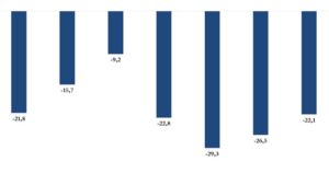 Caída de la industria en el segundo trimestre de 2020, en porcentajes