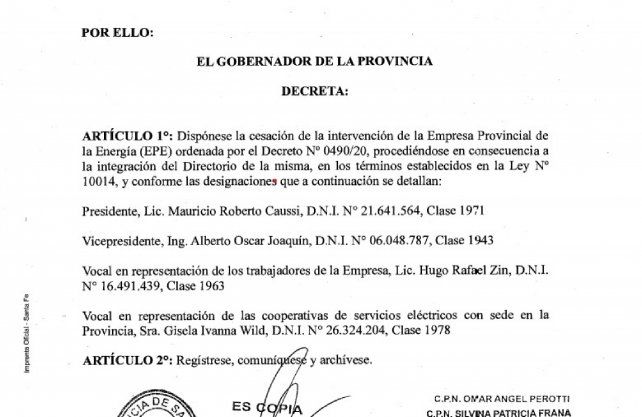 El gobernador Omar Perotti firmó el Decreto N° 1.173 con el que dio por terminada la intervención –ordenada por Decreto N° 490– sobre la Empresa Provincial de la Energía. La decisión llegó antes de cumplirse los plazos previstos que vencían en diciembre próximo. En el mismo decreto Perotti nombró como presidente de la EPE a quien condujo el proceso de intervención, Mauricio Caussi, mientras que como vicepresidente nombró a Alberto Oscar Joaquín, quien fuera el primer interventor de la empresa y quien desarrolló diferentes funciones en los gobiernos peronistas de la década del 90 y principios del 2000.