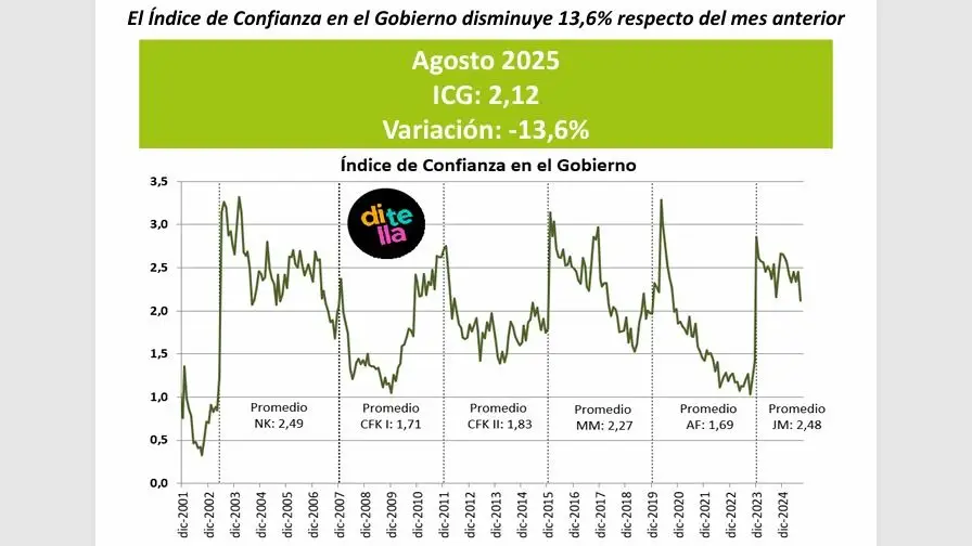 El ICG se confecciona desde noviembre de 2001 en base a una encuesta de opinión pública que realiza la consultora Poliarquía a nivel nacional y se mide en una escala de 0 a 5. Siempre resulta un muy buen predictor respecto al humor social sobre un gobierno. En agosto, el ICG fue de 2,12 puntos, nivel que implica una caída del 13,6% respecto del mes anterior, y del 16,5% en comparación al mismo mes del año pasado. Respecto a los dos últimos gobiernos, Milei se encuentra en este agosto un 14,3% mejor que el gobierno de Alberto Fernández a la misma altura -que sufría las consecuencias de la cuarentena por el Covid-, pero un 16,3% peor que la gestión de Mauricio Macri. En ambos casos también en la previa de las elecciones de medio término, que Macri ganó y Alberto Fernández perdió. Milei quedó en el medio de ambos.