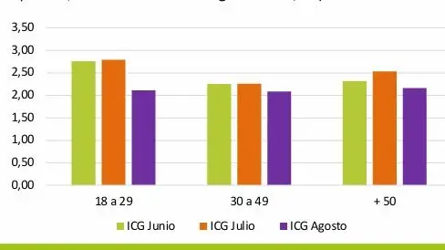Milei consiguió matener la inflación con mucho esfuerzo por debajo del 2%, pero a un costo social altísimo. Los salario y el consumo continúan deprimidos, y conseguir un trabajo estable y bien remunerado se vuelve cada vez más complicado. Los jóvenes son quienes más sienten el impacto de esa economía que no termina de arrancar y en la que tenían puestas sus ilusiones. Así se explica que en el último mes el segmento de los jóvenes entre 18 y 29 años el ICG quedó en 2,11 puntos, un drástico descenso del 24,4%. Entre las personas mayores de 50 años la medición fue de 2,16 puntos, con una disminución del 14,6%. En el segmento de personas entre 30 y 49 años se sostuvo en 2,08 puntos, una variación negativa del 8%.