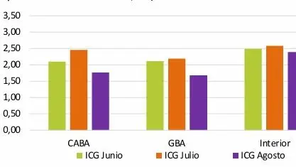 Otra particularidad de los apoyos a Milei es que siempre fueron predominantemente masculinos. El ICG de agosto fue mayor entre los hombres -2,42 puntos, con una caída del 8,3%- que entre las mujeres, que se ubicó en 1,80 puntos, con una baja del 20%. En lo referente a la zona geográfica, el ICG cayó considerablemente más en la zona del AMBA. En la Ciudad de Buenos Aires quedó en 1,76 puntos, con una merma significativa del 28,2%, mientras que quienes viven en el Gran Buenos Aires lo ubicaron en 1,68 puntos, también con una baja importante del 23,3%. El dato cobra una relevancia especial porque en unos días se votará en la provincia de Buenos Aires, la elección clave antes de las legislativas de octubre. Donde menos cayó fue en el interior del país, donde quedó en 2,39 puntos, un 7,4% más bajo que en julio.