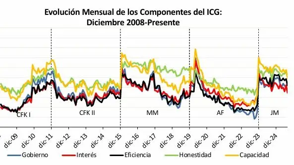 «La confianza en el gobierno alcanza, así, su valor más bajo desde el comienzo del mandato de Javier Milei, e interrumpe la relativa estabilidad que observó en los cuatro meses anteriores», informó el trabajo realizado por la Di Tella. En relación con el mes anterior, el ICG cayó en la medición de sus cinco componentes. El que más bajó fue la Preocupación por el interés general, que quedó en 1,73 puntos, un 18,2% menos que en julio. Lógico si se tiene en cuenta los vetos a repetición en materia de jubilaciones, financiamiento universitario, discapacidad y salud pediátrica, temas que preocupan al interés general.