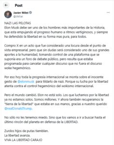 En Estados Unidos, la principal organización judía que escruta cualquier manifestación de antisemitismo, la Anti-Defamation League, lo describió como “un gesto raro en un momento de entusiasmo, pero no un saludo nazi». El propio Musk respondió en forma indirecta. Publicó sendas fotos de Trump y de Hitler tomando agua y posteó en X: «A Elon Musk le gustan los perros. También le gustaban a Hitler». Ninguna reacción fue tan virulenta como la del presidente argentino: