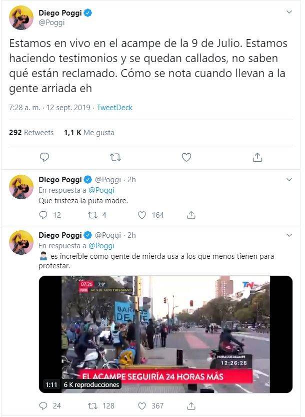 «Cómo se nota cuando llevan a la gente arriada eh. Estamos en vivo en el acampe de la 9 de Julio. Estamos haciendo testimonios y se quedan callados», escribió en las red social.