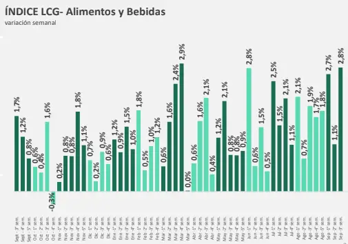 Por último, desde el Centro de Estudios Económicos y Sociales Scalabrini Ortiz (CESO), detallaron en la última semana los precios aumentaron 1,7%, mientras que si se calcula los últimos 30 días (hasta el 19 de septiembre), el alza acumulada es de 5,5%. Alimentos frescos registran un alza de 6,7% mensual y bebidas, de 6%.