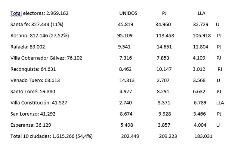 En detalle, el peronismo triunfó en las elecciones locales en seis de las diez ciudades más grandes de la provincia, mientras que la coalición gobernante Unidos que lidera Pullaro ganó en tres y los libertarios solo ganaron una. Esa decena de centros urbanos representa más del 54% del padrón santafesino: se trata de Rosario, la ciudad capital, Rafaela, Villa Gobernador Gálvez, Venado Tuerto, Reconquista, Santo Tomé, Villa Constitución, San Lorenzo y Esperanza. En la sumatoria de las diez ciudades, el justicialismo obtuvo 209.223 votos; Unidos, 202.449 sufragios; y LLA, 183.301.