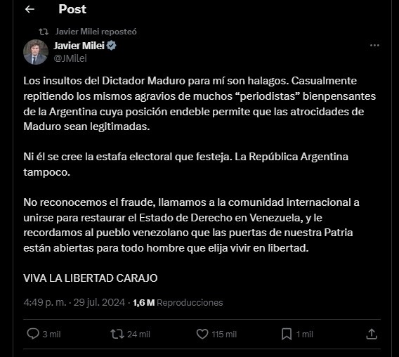 «NO RECONOCEMOS EL FRAUDE», ESCRIBIÓ MILEI EN X Y VOLVIÓ A AGREDIR AL PERIODISMO