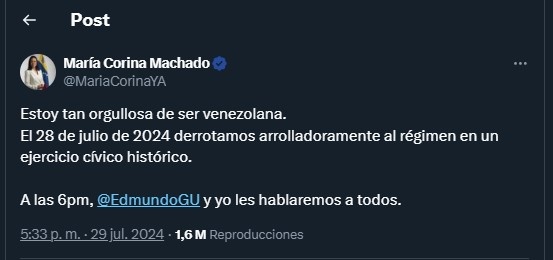 «El 28 de julio de 2024 derrotamos arrolladoramente al régimen en un ejercicio cívico histórico», reiteró en su publicación de X.