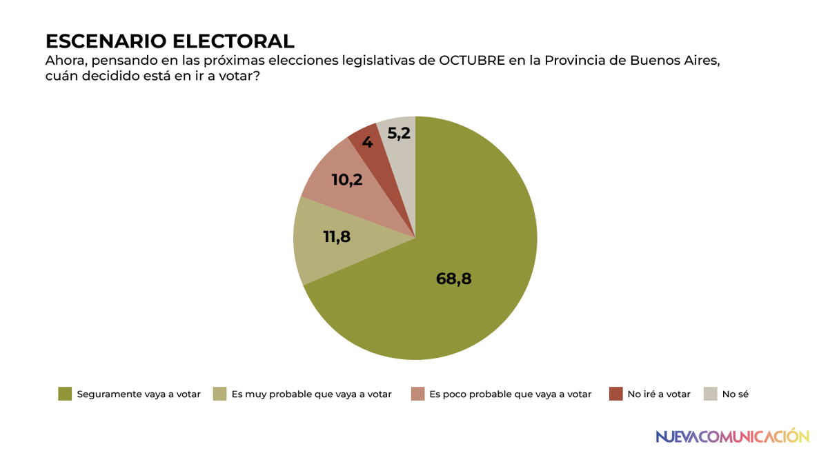 Otro dato relevante de la encuesta es que aborda la probabilidad de participación. Lo llamativo es que se produce una abrupta caída de una encuesta a la otra entre los que respondieron «Seguramente vaya a votar»: eran 76,8% a principios de mes y ahora son el 68,8%. 8 puntos menos.