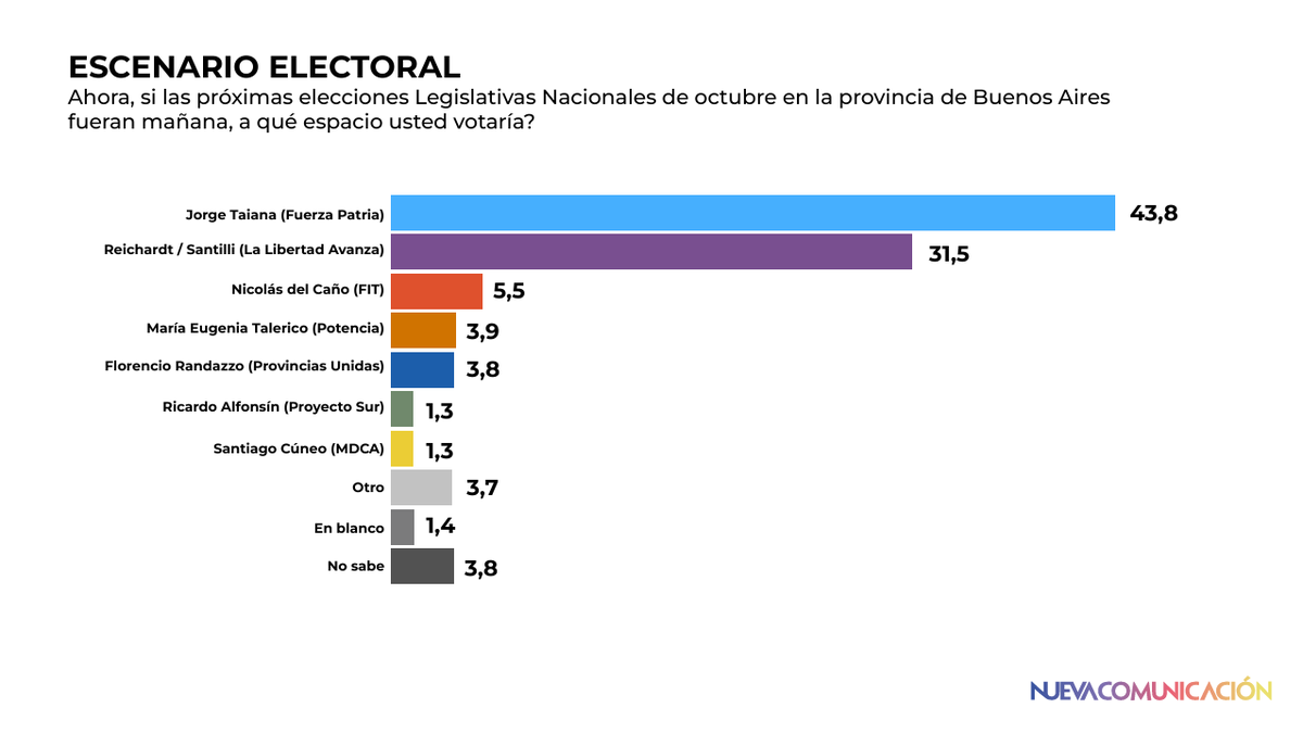 A 10 días de las elecciones, el trabajo confirma la ventaja de Fuerza Patria con Jorge Taiana como cabeza de lista de diputados nacionales, quien recibe el 43,8% de la intención de voto.