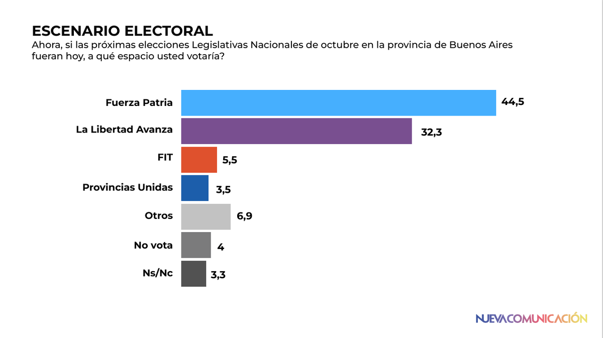 La encuesta de Nueva Comunicación ratifica que la brecha a favor de Fuerza Patria se mantiene en el nivel de la elección bonaerense.