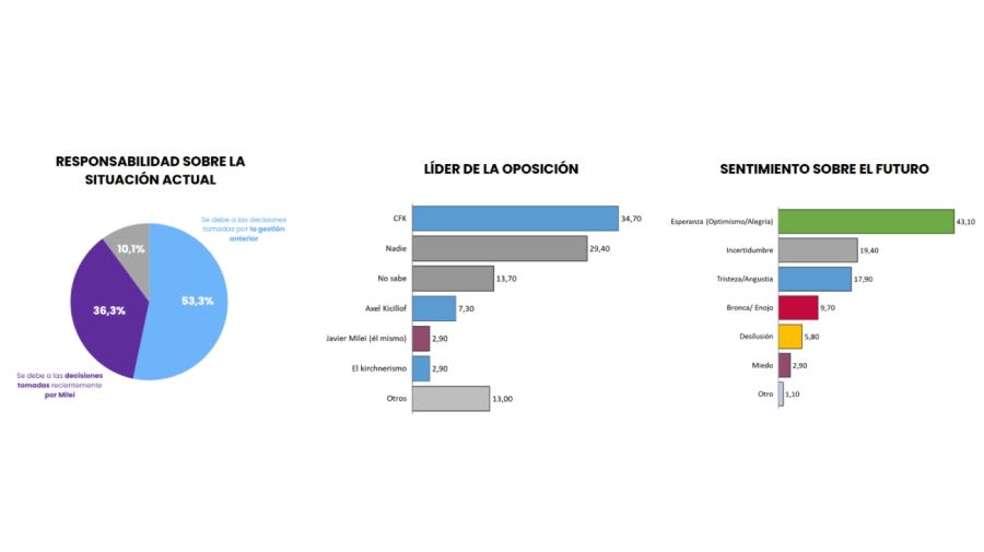 Parte del apoyo obtenido por Milei radica en que un 53,3% responsabiliza al gobierno anterior por la situación actual, contra un 36,3% que responsabiliza al oficialismo. Asimismo, la oposición se ve desdibujada, con un 43,10% que dice que no sabe quién es el líder o no considera a nadie como tal, contra un 34,70% que encuentra el liderazgo en la ex vicepresidenta Cristina Kirchner y otro 7,30% en el gobernador bonaerense Axel Kicillof.