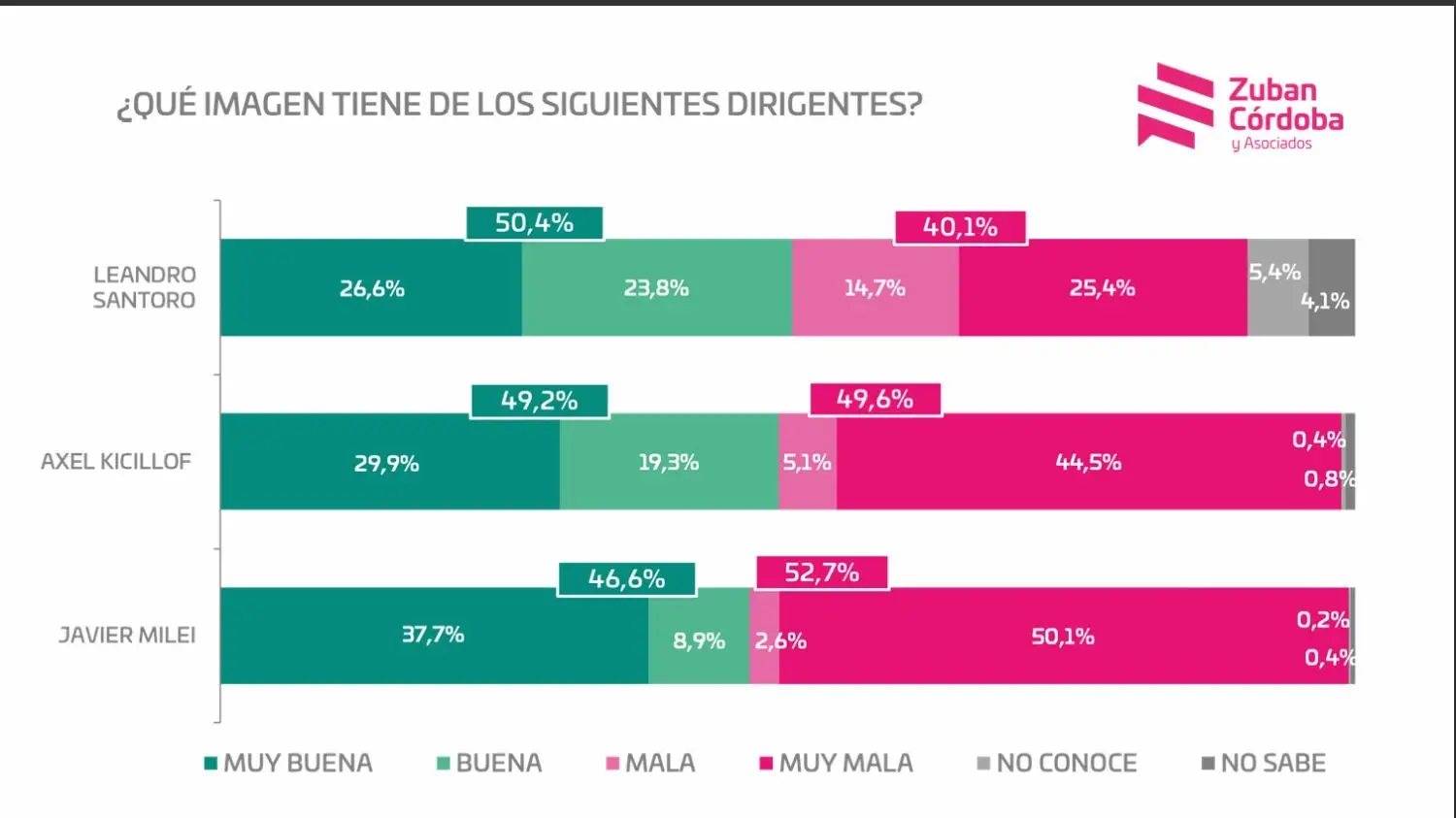 Una nueva encuesta muestra un baja en la aprobación del Gobierno de casi un punto en el último mes, por lo que los rechazos ya llegan al 53,2% contra el 46,6% de aprobación. Una novedad, por primera vez dos dirigentes opositores como Leandro Santoro y Axel Kicillof aventajan en imagen positiva a Javier Milei.