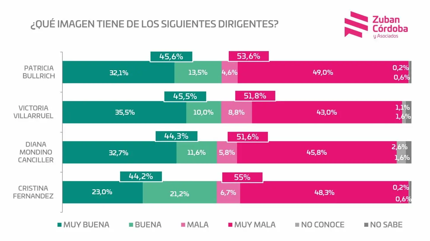 Patricia Bullrich, Victoria Villarruel y la canciller Diana Mondino, tres de las mujeres relevantes del oficialismo, les siguieron en imagen y luego quedó la ex presidenta Cristina Kirchner, mucho mejor posicionada que en la encuesta del mes anterior. En cambio, quien no levanta es el reasumido como titular del PRO, Mauricio Macri, quien alcanzó el 63,5% de imagen negativa.