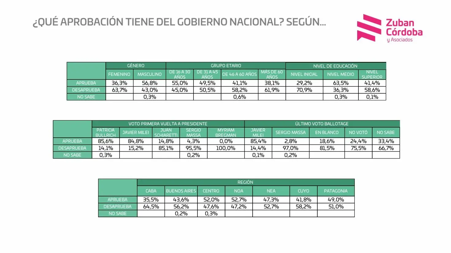 Los datos surgen del sondeo de mayo de la consultora Zuban Córdoba y Asociados, cuyos resultados se conocieron este fin de semana. En comparación con el trabajo previo, el rechazo al Gobierno nacional creció casi un punto hasta ubicarse en el 53,2%, entre la mayoría que respondió que desaprobaba totalmente la gestión (49,9%) y los que desaprobaban «algo» (3,3%). En la misma proporción cayó la aprobación, que se ubicó en el 46,6% contra el 47,4% del sondeo de abril. El desagregado de estas opiniones siempre resulta interesante porque hay diferencias importantes en cuanto a género y ubicación geográfica.
