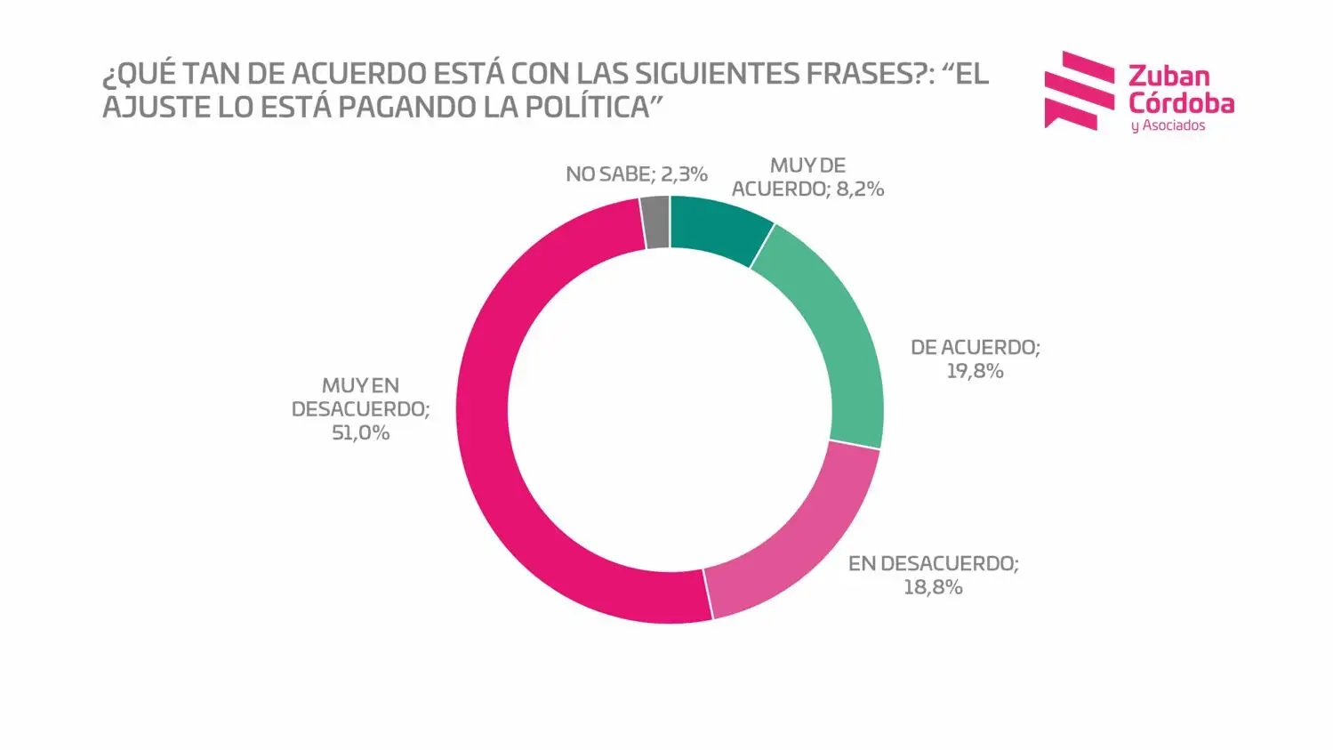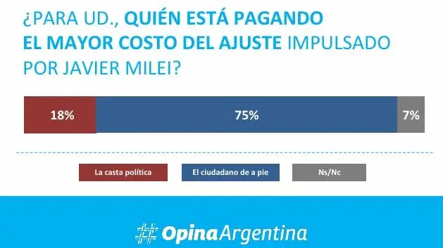 En comparación con el de Zubán Córdoba, el trabajo de mayo de la consultora Opina Argentina, que dirige Facundo Nejamkis, encontró estabilidad en cuanto aprobación y rechazo a la gestión de Milei. Sin embargo, en lo referido a la famosa motosierra, allí tampoco hubo dudas acerca de que el ajuste lo está pagando el ciudadano de a pie (75%) y no la casta política (18%). La dirección del Gobierno ya parece muy clara. Con todo, hay algunos que todavía le dejan el crédito abierto a la espera de otros resultados, pero hay otro sector -que se va convirtiendo en mayoritario- que está de acuerdo con el rumbo emprendido.