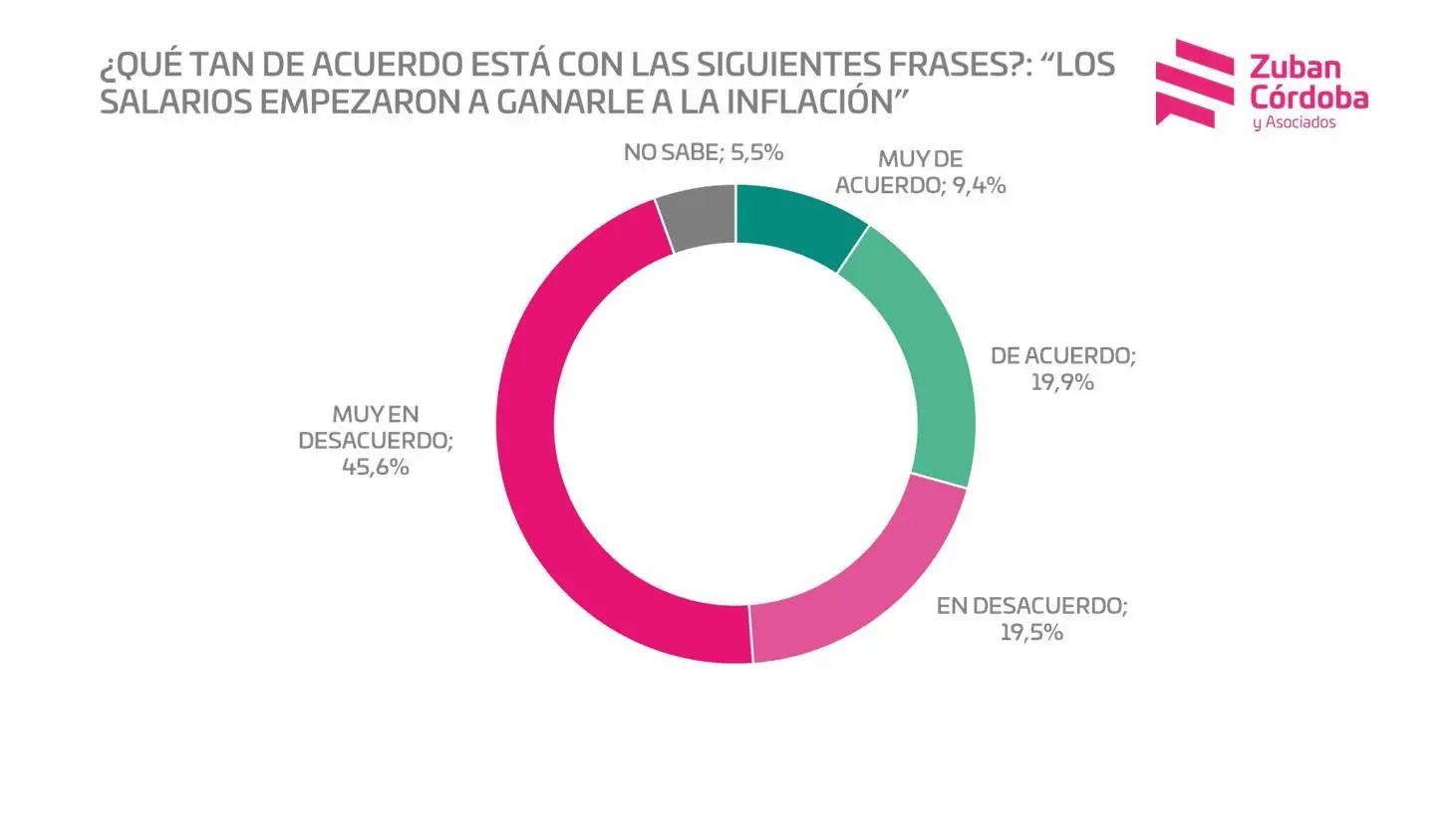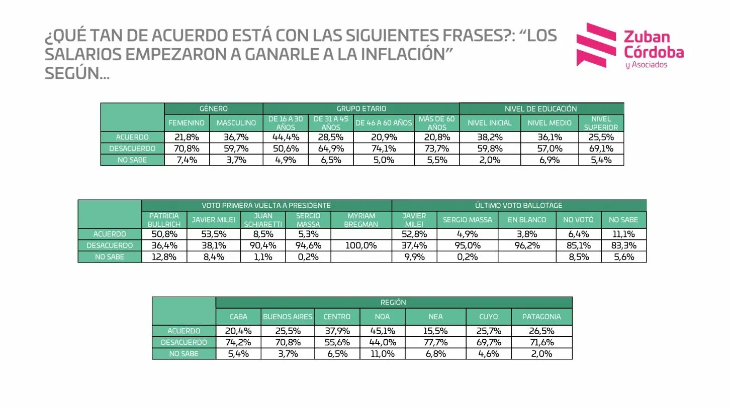 Este malestar creciente que se percibe en cada pregunta del cuestionario tiene que ver con la cada vez más expandida certeza de que el mega ajuste en marcha no lo está pagando la casta, algo que la gente nota en el bolsillo. Casi un 70% se mostró en desacuerdo con la idea de que el ajuste lo está pagando la política y un 74% consideró que evidentemente «lo estamos pagando todos». Con mayor justeza, un 65% no creyó en la afirmación del Presidente acerca de que los salarios le ganaron a la inflación en estos úktimos meses. Una curiosidad: sólo en la región del NOA -que comprende a las provincias de Jujuy, Salta, Catamarca, Tucumán y Santiago del Estero- respondieron mayoritariamente que los salarios vienen ganando esa carrera. ¿Un salariazo oculto?
